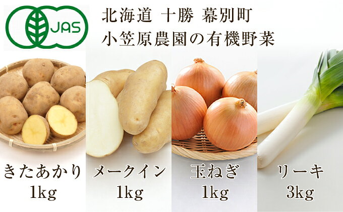 【ふるさと納税】小笠原農園の有機野菜4種詰合せ(きたあかり1kg・メークイン1kg・玉ねぎ1kg・リーキ3kg)【北海道十勝幕別】≪2022年秋出荷先行予約≫ 【野菜・じゃがいも・ジャガイモ・たまねぎ・玉葱・タマネギ・セット・詰め合わせ】 お届け:2022年9月下旬〜12月下旬