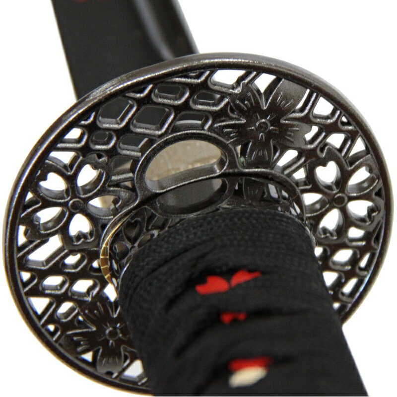 模造刀 美術刀 黒斬剣 艶桜 大刀 刃紋入り刀身 メッキ合金[gst-nt-165-d]日本刀 美術刀剣 おもちゃ 通販【代引き不可】黒斬剣 〜艶桜拵え〜 大刀◆刀身サイズ◆全長約110×刃渡74×柄長30cm◆刀身重さ◆総重量 約1270g(鞘を払って 約1000g)◆仕様◆刀身:刃紋入り刀身 メッキ合金鞘:朴の木柄:プラ製(桜小紋入り合皮)、金具:合金柄糸:人絹 白糸、黒呂に桜散らし塗り鞘樋入り黒塗り刀身 桜散らし刃紋縁金具:草の図、頭金具:無地肥後金具柄下地:黒合皮に桜小紋散らし、鍔:桜透かし鍔美濃の国、関は鎌倉時代の昔から幾多の名匠が育った。