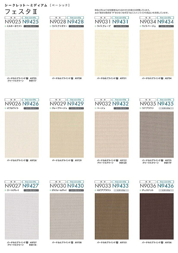 注)メーカー希望小売価格はメーカーカタログに基づいて掲載しています ニチベイ フェスタ2 生地:N9025〜9048 税別価格 単位(cm) ↓高さ 幅→ 20〜30 30.5〜50 50.5〜80 80.5〜120 120.5〜160 160.5〜200 200.5〜240 240.5〜270 10〜49 8415 8415 9460 11165 11935 13365 15235 15950 50〜80 8855 8855 10450 12045 13420 14740 16830 17655 81〜120 9735 9735 11550 13365 14960 16390 18700 19580 121〜160 10395 10395 12815 14795 16500 18150 20735 21725 161〜200 11165 11165 14135 16335 18205 19855 22715 23815 201〜250 12100 12100 15290 17765 19690 21560 24640 25850ダブルタイプ(オプション仕様) N9226/N9042 部品色:ホワイト 生地機能マークの説明はこちら→ ※青色の品番はウォッシャブル生地の品番となります。