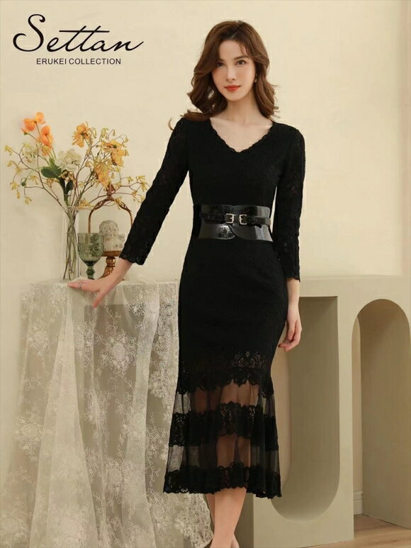 【2000円OFFクーポン対象】 エルケイ ERUKEI ドレス S9020 キャバドレス ワンピース 袖あり 五〜七分袖 フレア ミニドレス ミモレ丈 ERUKEI ナイトドレス セクシー 無地 レース 使用 レディース スナック クラブ 女性 大人